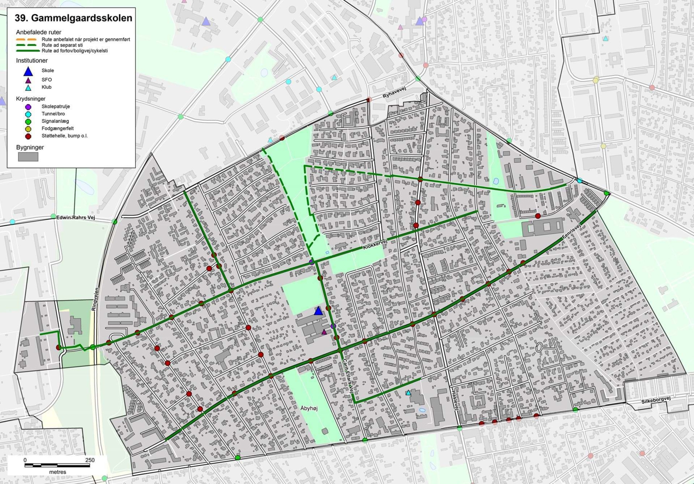 På kortet viser vi de skoleveje, som vi anbefaler til børnene. Husk: Øvelse gør mester, og det er en god ide, at du øver skolevejen sammen med dit barn.